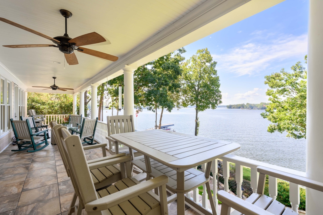 From the full-length porches on both the main and lower levels, the home has prime sunset views over the lake.