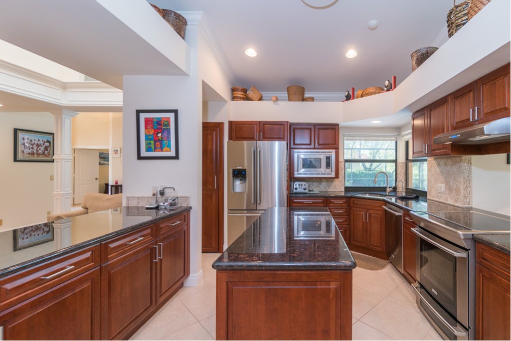 This recently remodeled home at 1487 Sweetbay Cir offers 3,400 sf of living space. Set on a cul-de-sac, the home has an expanded floor plan. Enjoy nature and golf views from the protected outdoor swimming pool.