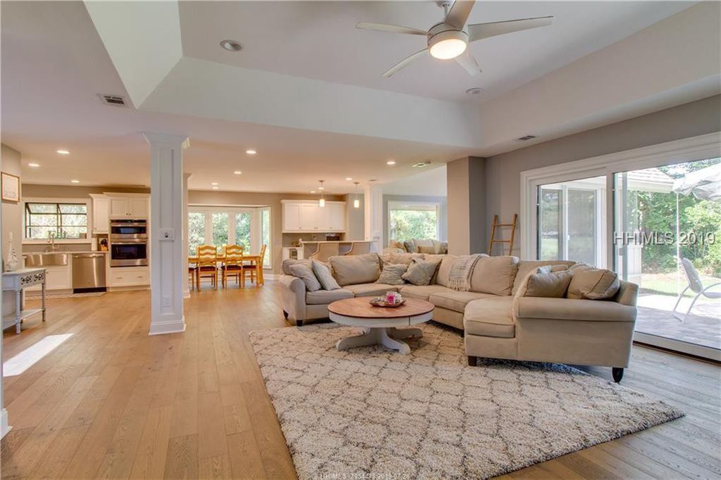 This totally renovated one-level home at 32 Brown Thrasher Rd offers 2,549 sf of living space, all in pristine condition, plus views of two holes on the front nine of the Dolphin Head golf course.