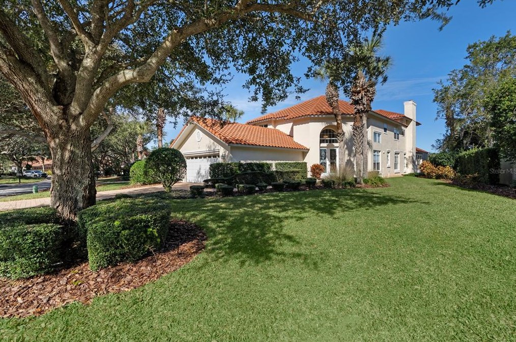 Enjoy relaxing lake views from this Spanish style courtyard home on a quiet cul-de-sac at 24 La Costa Place in Hammock Dunes, FL.