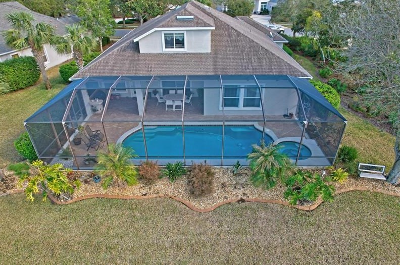 Towards the back of the house, extra-large pocket sliders lead to a private screened lanai with travertine pavers. Send me more about this lake view home in Hammock Dunes!
